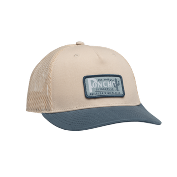 Introducing the Coastal Plains trucker hat. This snapback features an off-white crown and mesh backing, with a blue bill and Poncho cactus patch.