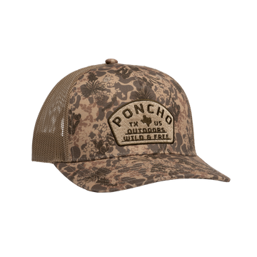 Made to blend into the south Texas brush. This hat features a mesh back, Poncho badge, and darker flavor of our South Zone Camo. Snapback closure.